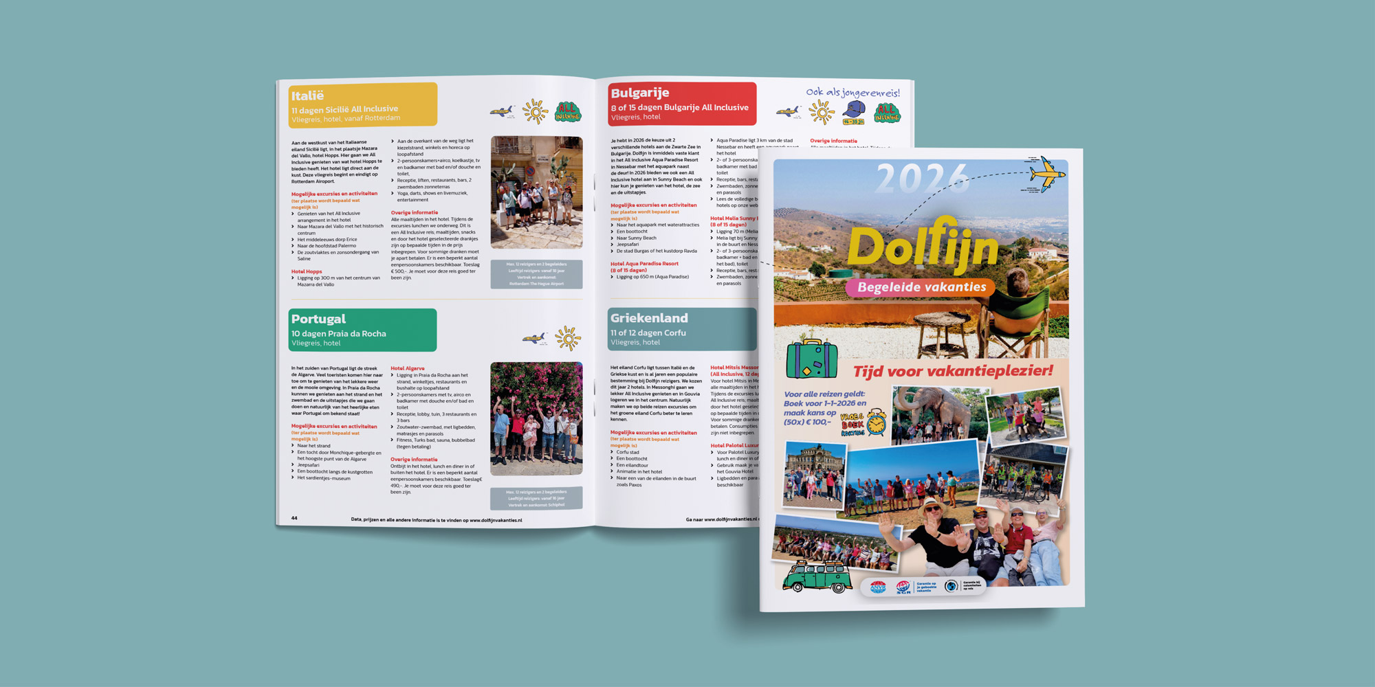 Voor Dolfijn Vakantiereizen hebben wij de nieuwe reisbrochure ontworpen voor 2026. Een project waarin alles samenkwam waar wij blij van worden: een sterk merk, een heldere missie en de wens om klanten écht goed te informeren én te inspireren.